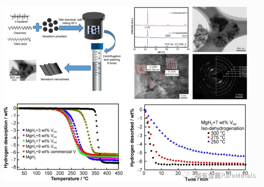 1.利用一種濕化學(xué)球磨法制備了二維結(jié)構(gòu)的釩納米片,并將其作為催化劑引入到MgH2儲(chǔ)氫材料