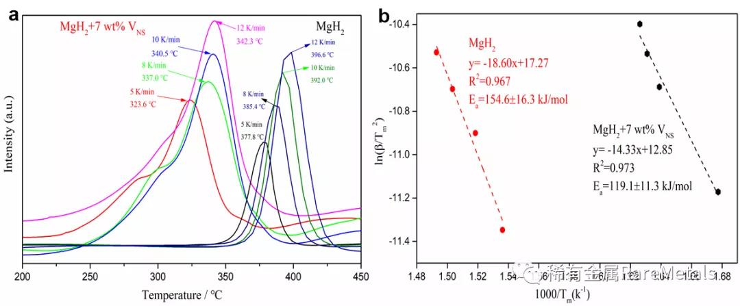 圖4(a) MgH2+7 wt% VNS在不同升溫速率下DSC曲線圖,圖4(b) 用Kissinger法計(jì)算的表觀活化能
