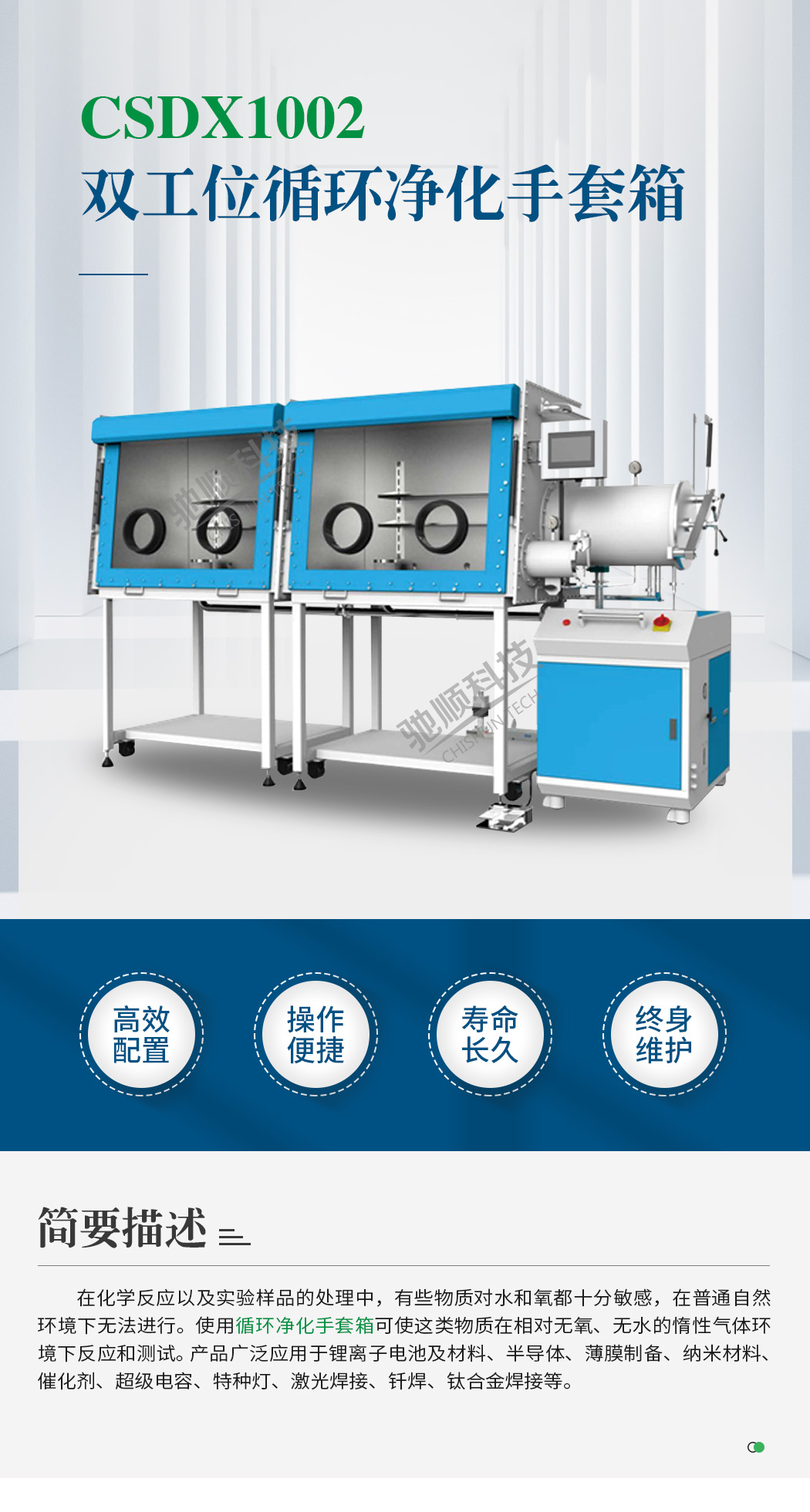 在化學(xué)反應(yīng)以及實(shí)驗(yàn)樣品的處理中,有些物質(zhì)對(duì)水和氧都十分敏感,在普通自然環(huán)境下無(wú)法進(jìn)行。使用循環(huán)凈化手套箱可使這類物質(zhì)在相對(duì)無(wú)氧、無(wú)水的惰性氣體環(huán)境下反應(yīng)和測(cè)試。 產(chǎn)品廣泛應(yīng)用于鋰離子電池及材料、半導(dǎo)體、薄膜制備、納米材料、催化劑、超級(jí)電容、特種燈、激光焊接、釬焊、鈦合金焊接等。