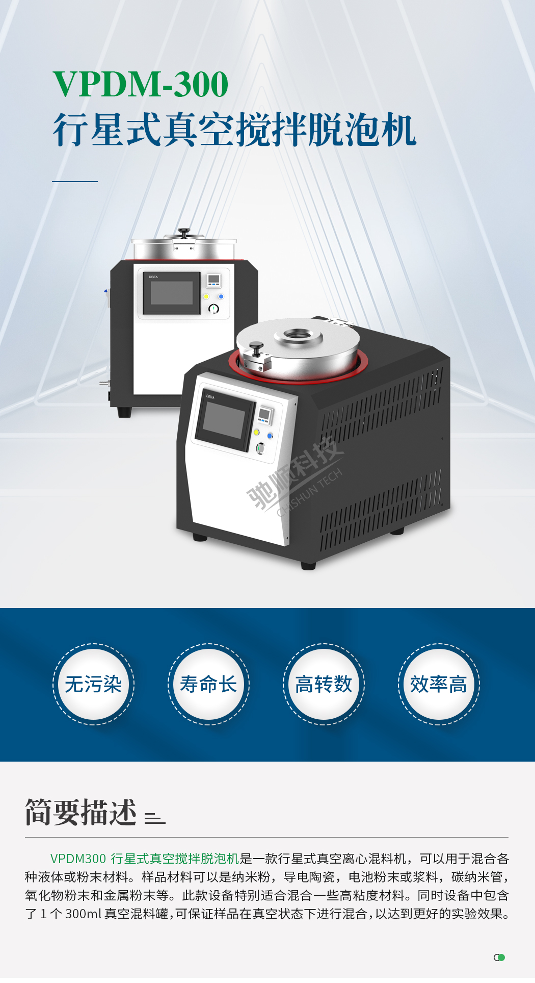 簡要描述:VPDM300行星式真空攪拌脫泡機一款行星式真空離心混料機,可以用于混合各種液體或粉末材料。樣品材料可以是納米粉,導電陶瓷,電池粉末或漿料,碳納米管,氧化物粉末和金屬粉末等。