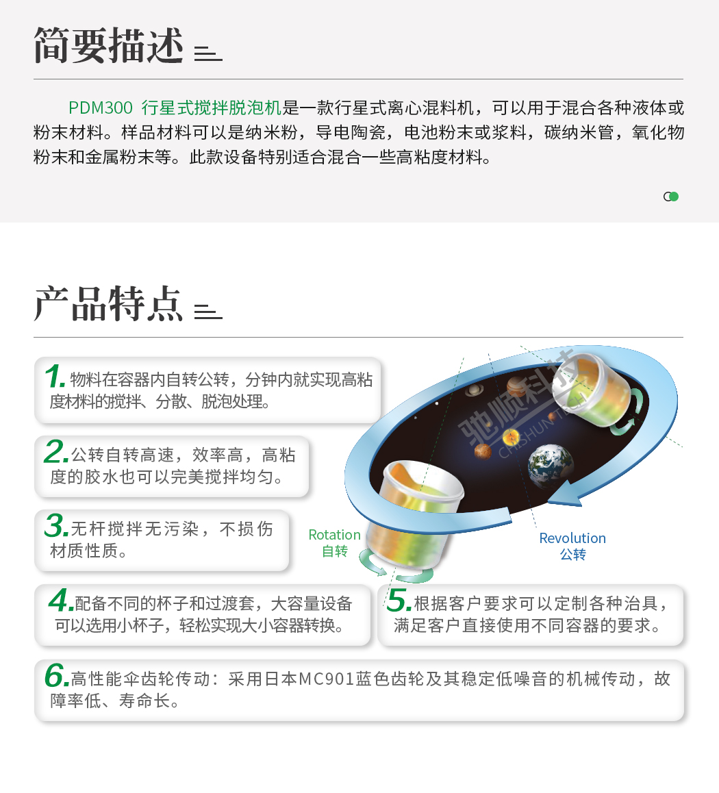 PDM300行星式脫泡攪拌機(jī)是一款行星式離心混料機(jī),可以用于混合各種液體或粉末材料。樣品材料可以是納米粉,導(dǎo)電陶瓷,電池粉末或漿料,碳納米管,氧化物粉末和金屬粉末等。行星式脫泡攪拌機(jī)廣泛應(yīng)用于LED、LCD、電子元器件、納米粉體材料、精細(xì)化工材料、印刷電子材料、電子封裝材料及新能源材料等高、尖、精領(lǐng)域產(chǎn)品的材料的混合攪拌領(lǐng)域,如熒光粉、硅膠、銀漿、鋁漿、粘合劑、油墨、銀納米顆粒、銀納米線、LED/OLED/SMD/COB導(dǎo)電銀膠、絕緣膠,RFID印刷導(dǎo)電油墨及各向異性導(dǎo)電膠ACP、薄膜太陽(yáng)能電池用導(dǎo)電漿料、PCB/FPC用導(dǎo)電油墨等等,從液態(tài)到固態(tài)、液態(tài)與液態(tài)、固態(tài)與固態(tài)物質(zhì)的攪拌均可。